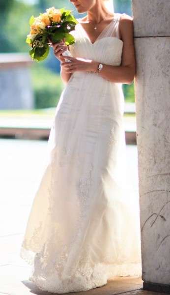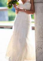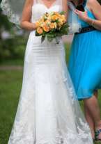 Очень красивое и нежное свадебное платье. Цвет молочный / айвори, с бежевым поясом и аккуратной вышивкой из бисера на нем. Облегающий силуэт - "русалка" и сверху шифоновая вуаль с кружевом. Есть небольшой шлейф, который можно убрать, пристегнув к платью или просто одеть на руку. Спинка с расширением на шнуровке. Размер М (44-46). Состояние хорошее. Одевалось один раз. После свадьбы отдавалось в химчистку. Территориально нахожусь в Зеленограде.