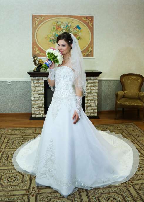 Продам прекрасное белое свадебное платье Miss Kelly (Франция) с длинным шлейфом, расшитое бисером. Платье в отличном состоянии. Шлейф подкалывается сзади. В подарок к нему идут: фата и перчатки. Размер 42-44. Покупала платье в салоне. Торг возможен после примерки.