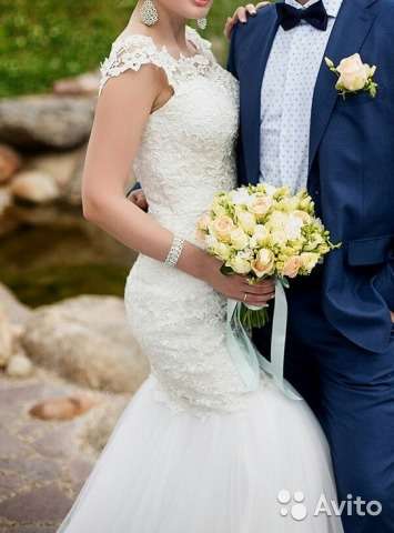 Продается красивое свадебное платье фасона "рыбка". Отлично сидит по фигуре. Одевалось 1 раз. В отличном состоянии. Низ платья можно отстегнуть, так что можно быть как в длинном платье, так и в коротком. В подарок отдам туфли 37 размера. По Вашему желанию могу отправить вам еще фотографии.